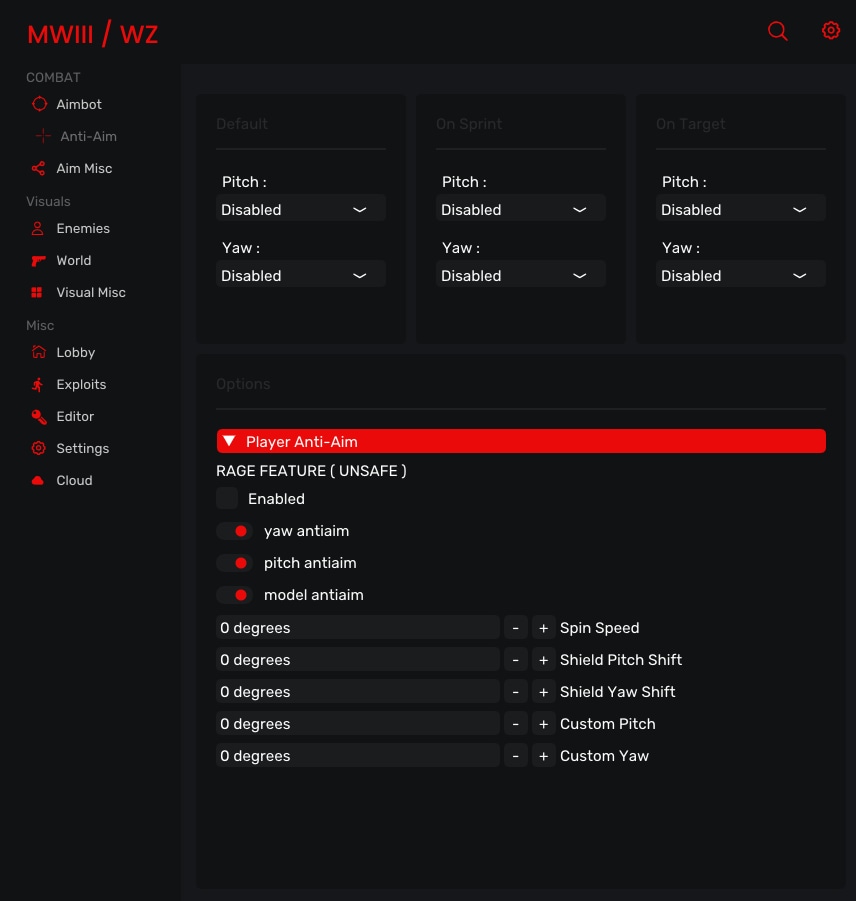 Anti-Aim [+] Default (Pitch & Yaw) [+] On Target (Pitch & Yaw) [+] On Sprint (Pitch & Yaw) [+] Spin Speed [+] Custom Pitch & Yaw