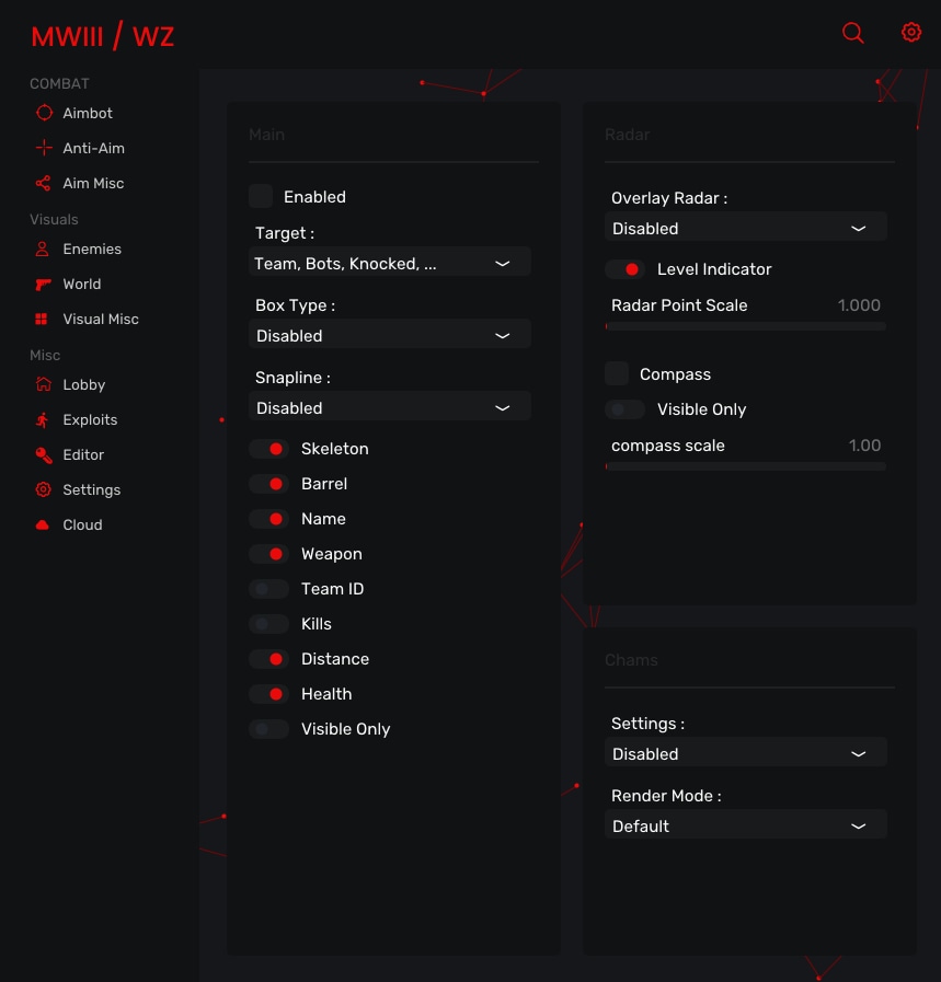 ESP [+] Box Type (3D, 2D) [+] SnapLine [+] Skeleton [+] Name ESP [+] Weapon ESP [+] Distance ESP [+] Health ESP [+] Visible Only [+] Radar [+] Chams ESP