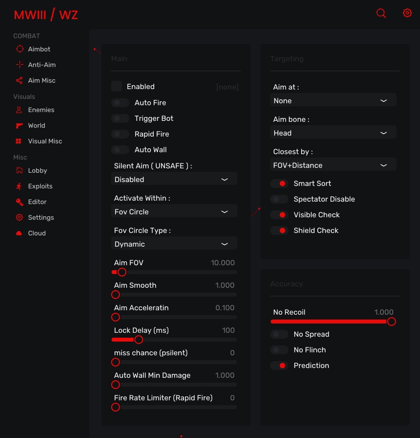 Aimbot [+] Auto-Fire [+] Trigger Bot [+] Rapid Fire [+] Auto Wall [+] Silent Aim (Server & Client) [+] Aimbot Smooth [+] Aimbot FOV [+] Aim Acceleration [+] Lock Delay(ms) [+] Miss Chance [+] Aim Bone (Head, Neck, Body) [+] Closest By (FOV+Distance) [+] Visible Check [+] No Recoil
